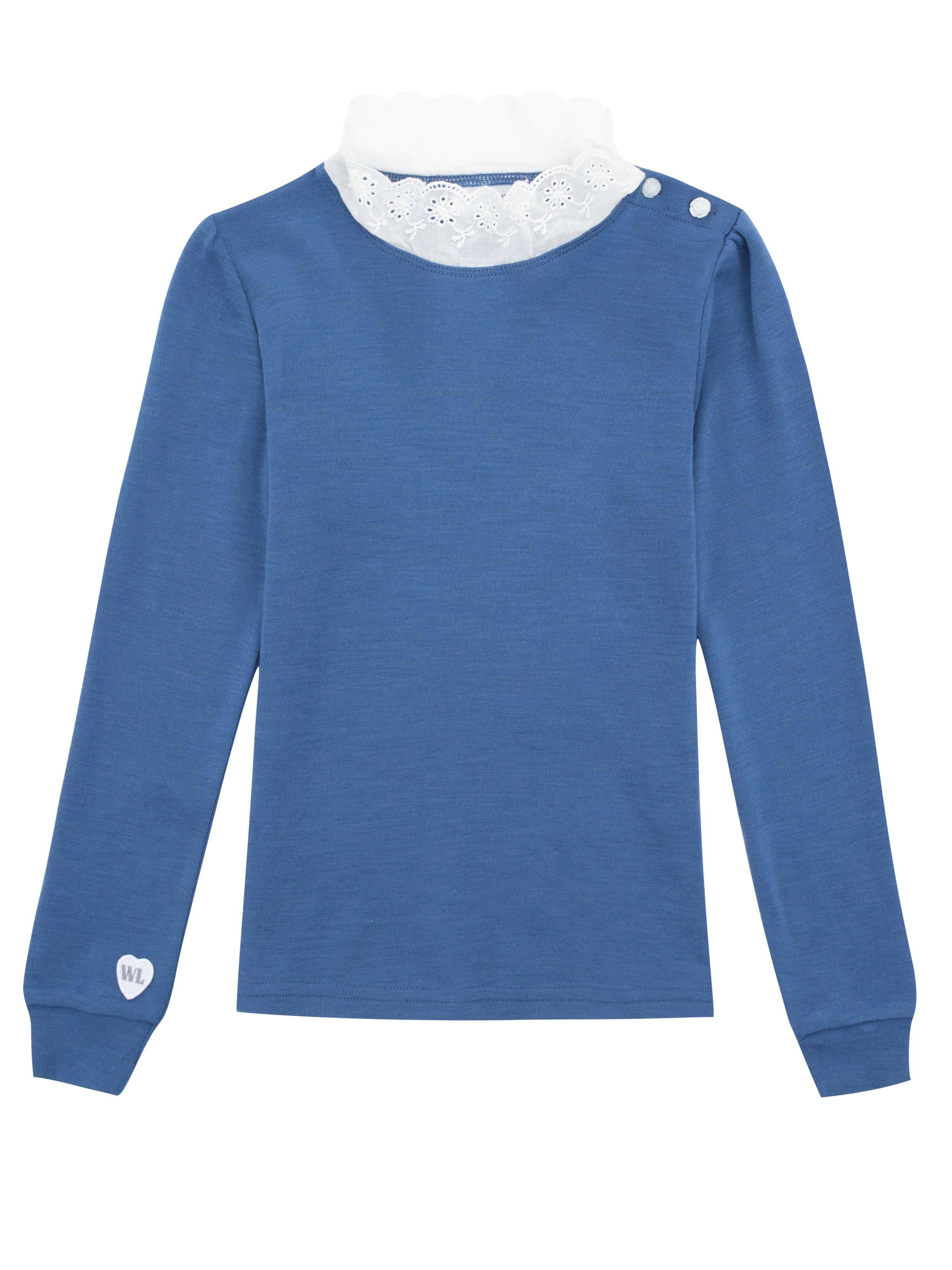 Pearl buttons on the shoulder and soft, delicate lace edges along the lower edge of the sweater, lower sleeve edge and around the neck. The top also has cute ruffles over the shoulders and match it with Berrgen wool pants to get the complete look.