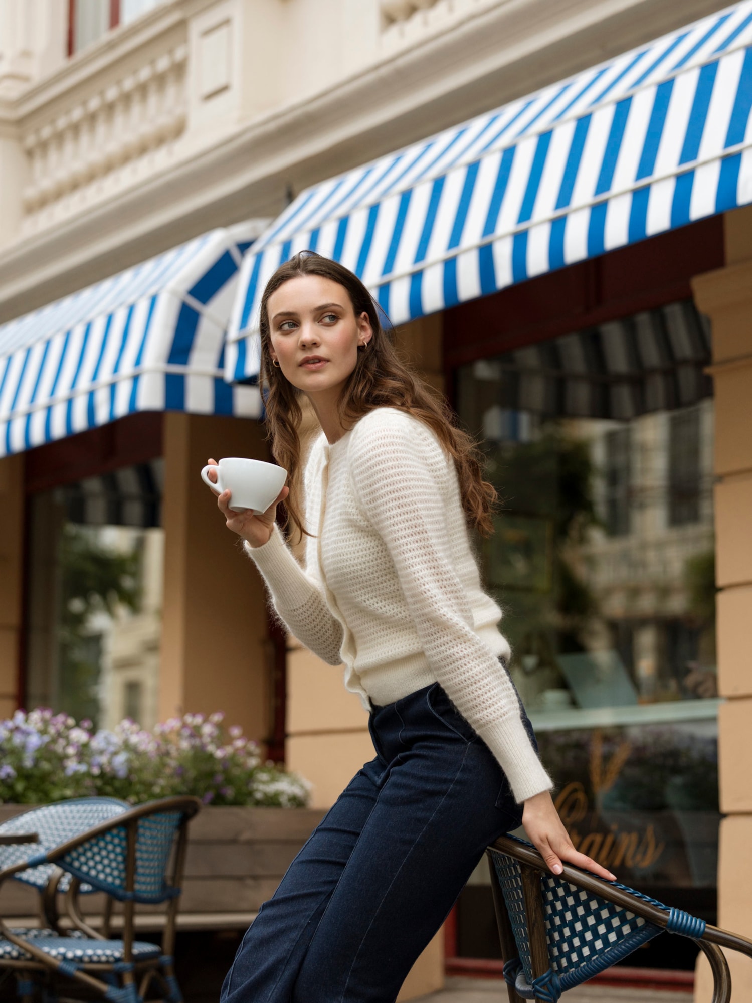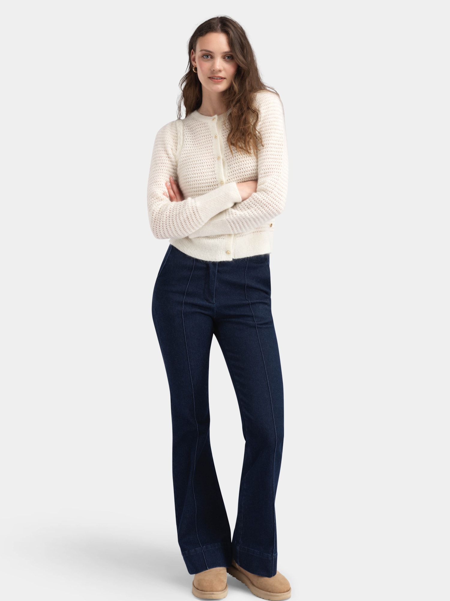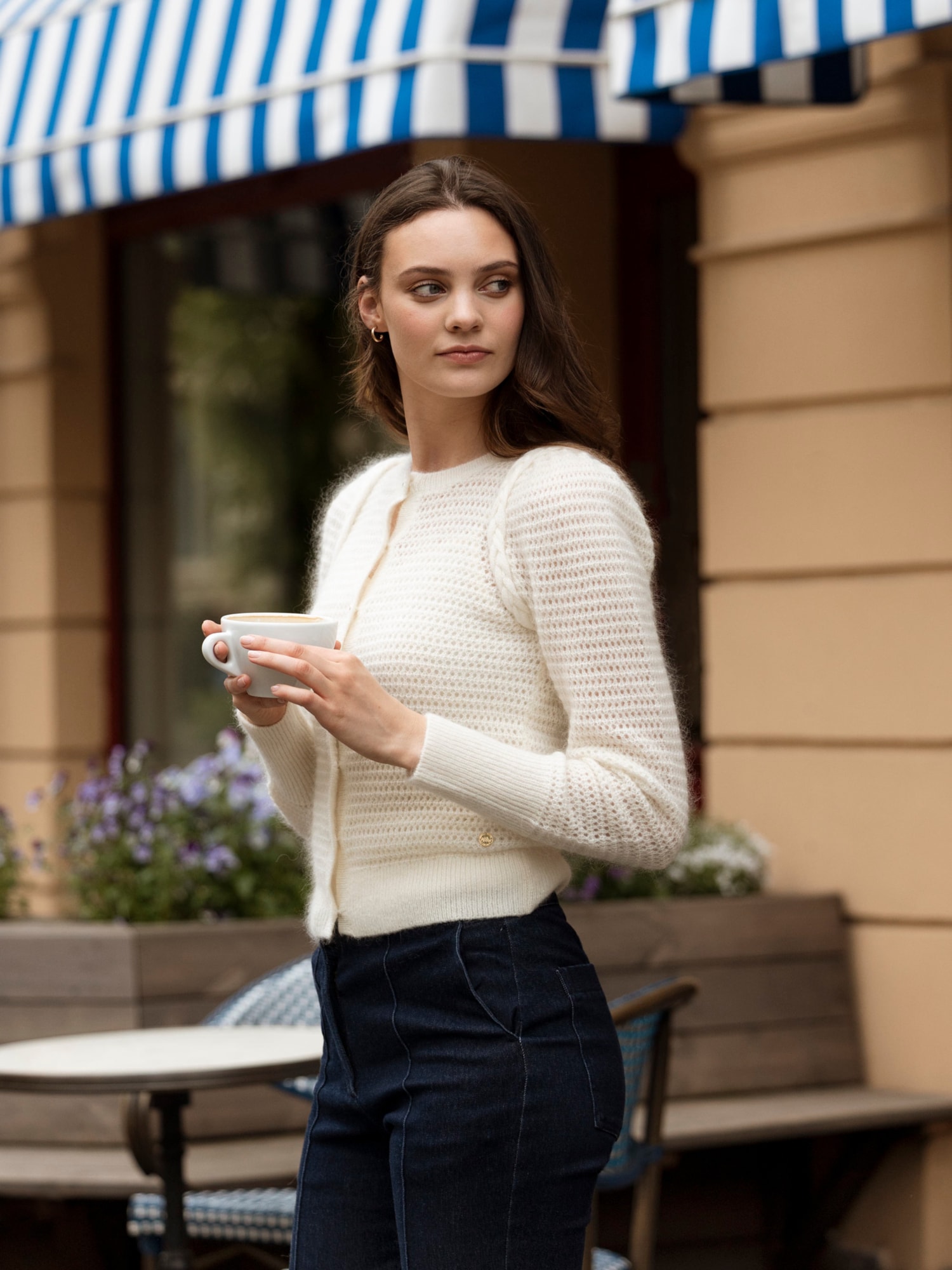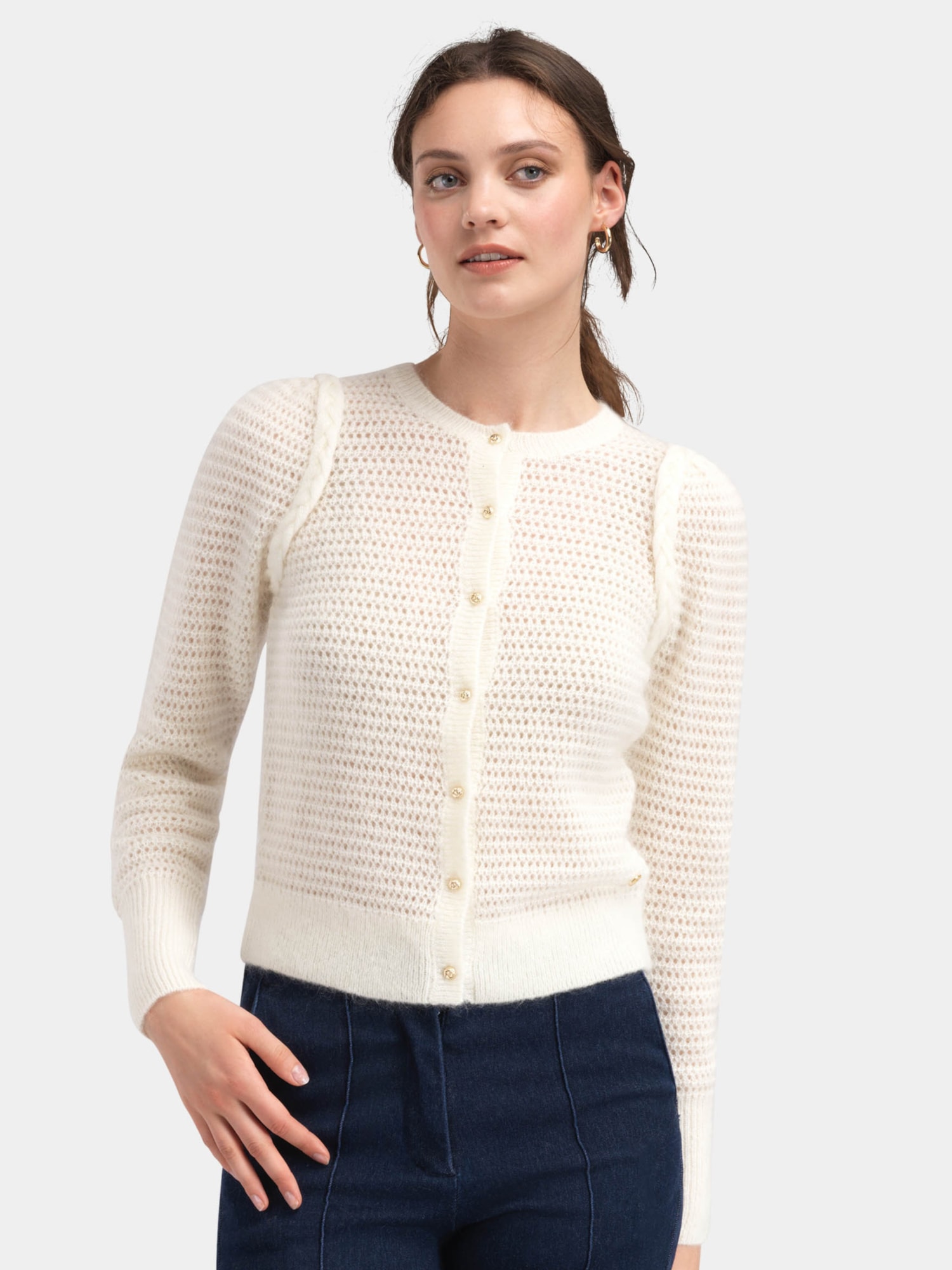 Bitihorn strikkejakke til dame er laget i en myk og behagelig ullblanding som varmer godt. Jakken har rund hals og er ribbestrikket langs linning, mansjetter og hals. Søte flettedetaljer ved skuldrene og knapper i front gir den et feminint og gjennomført uttrykk.