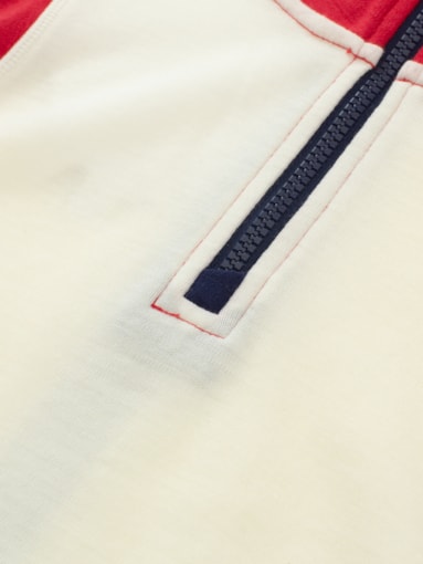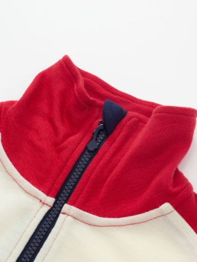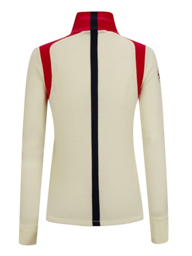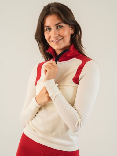 • A sporty half-zip sweater made of 100% merino wool with Hydroduct panels on the back that gives the wool super-absorbent abilities against moisture and sweat. The top has a cool, retro design with a contrasting color on the neck and shoulders, as well as a half-zip zipper for regulating warmth and thumb holes for extra comfort during activity.