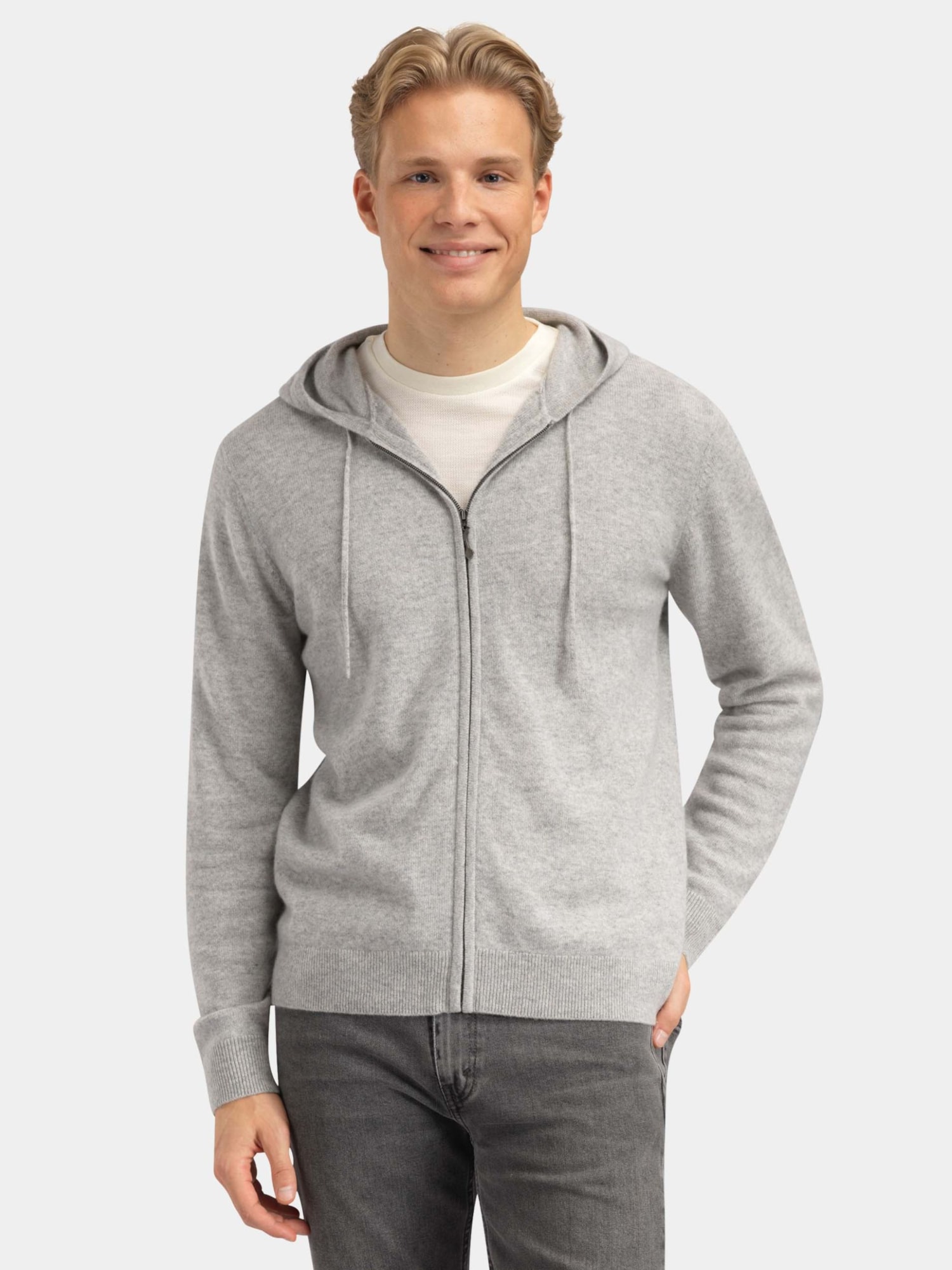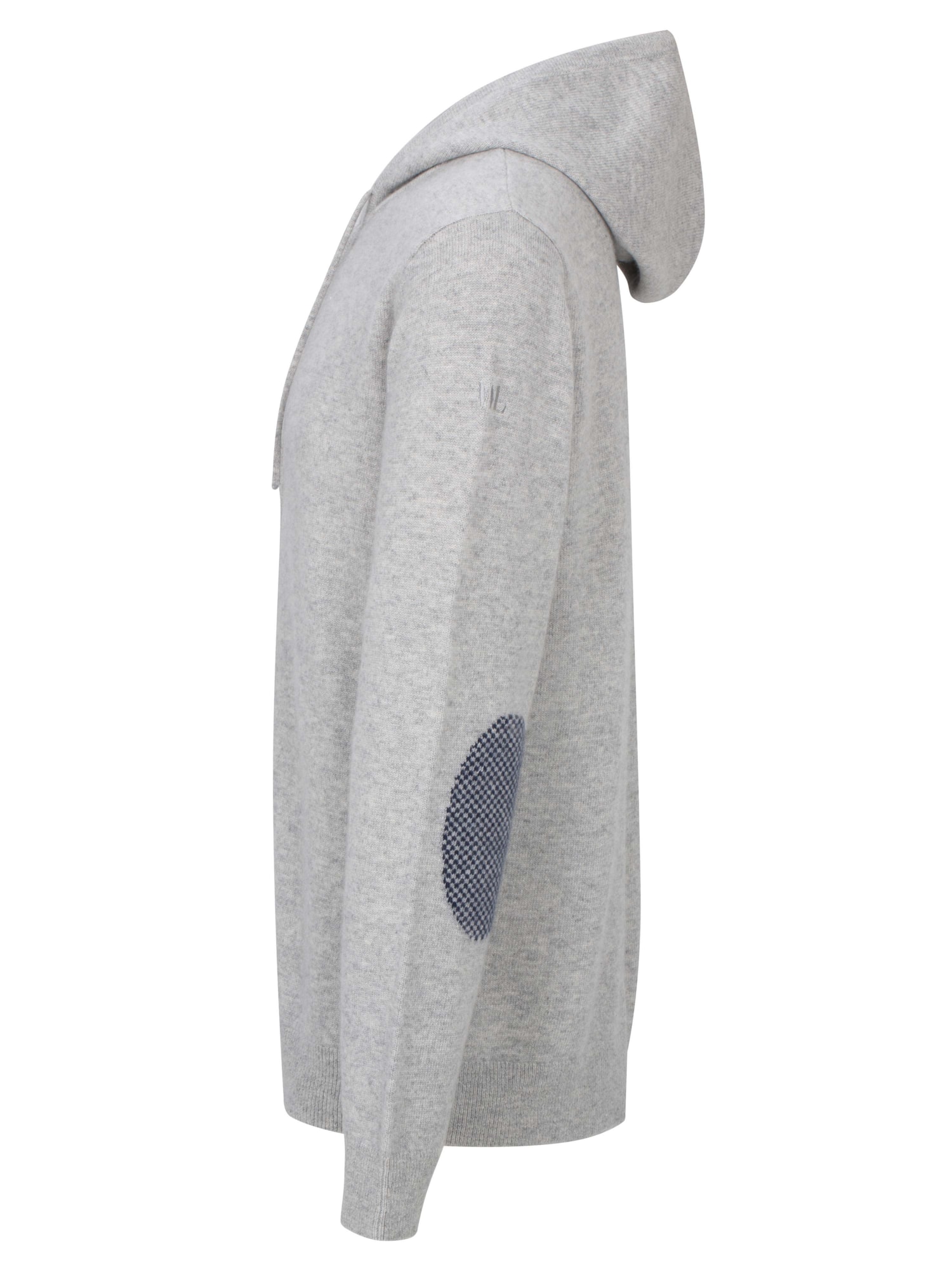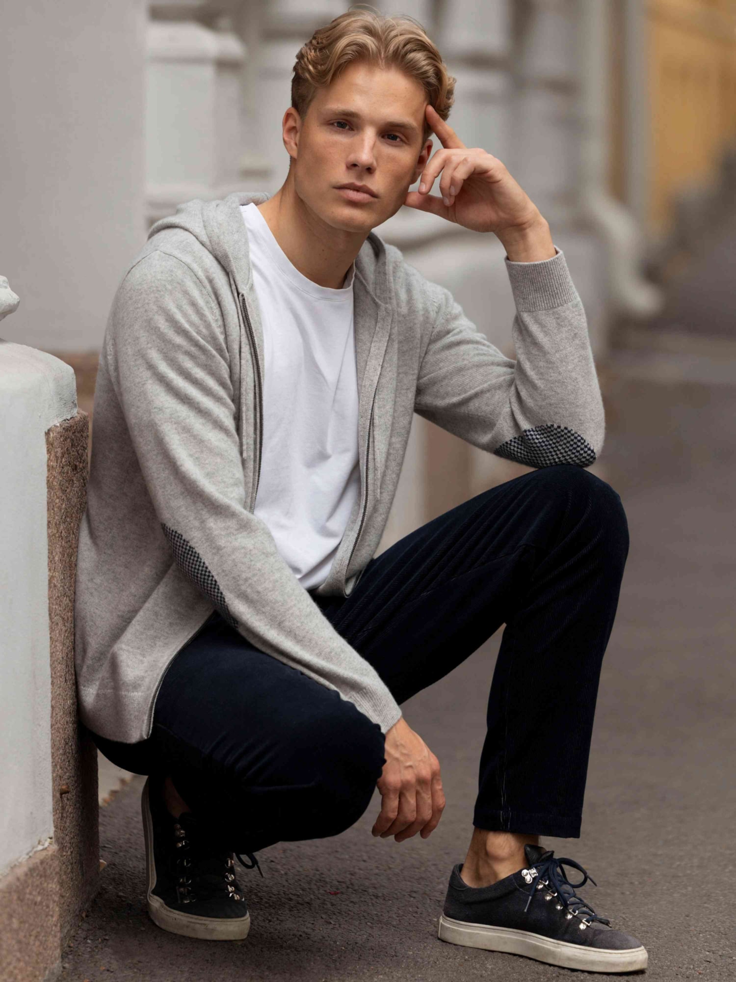 This exclusive men’s jacket in 100% cashmere combines luxury and comfort with a sporty, modern style. It features a full front zipper, a high collar with drawstring, and ribbed cuffs and hem for a perfect fit. Contrasting elbow patches add a timeless and masculine touch.