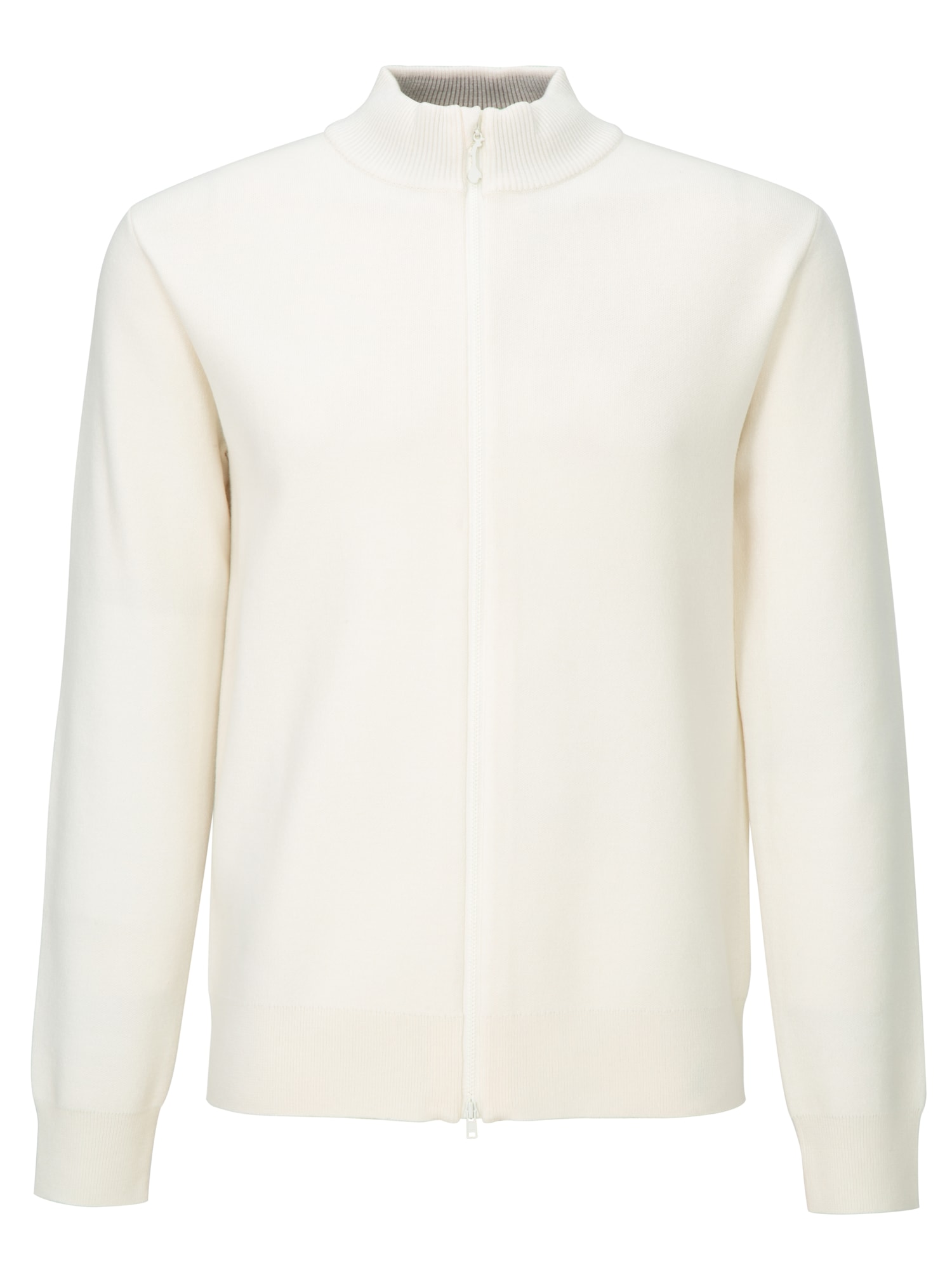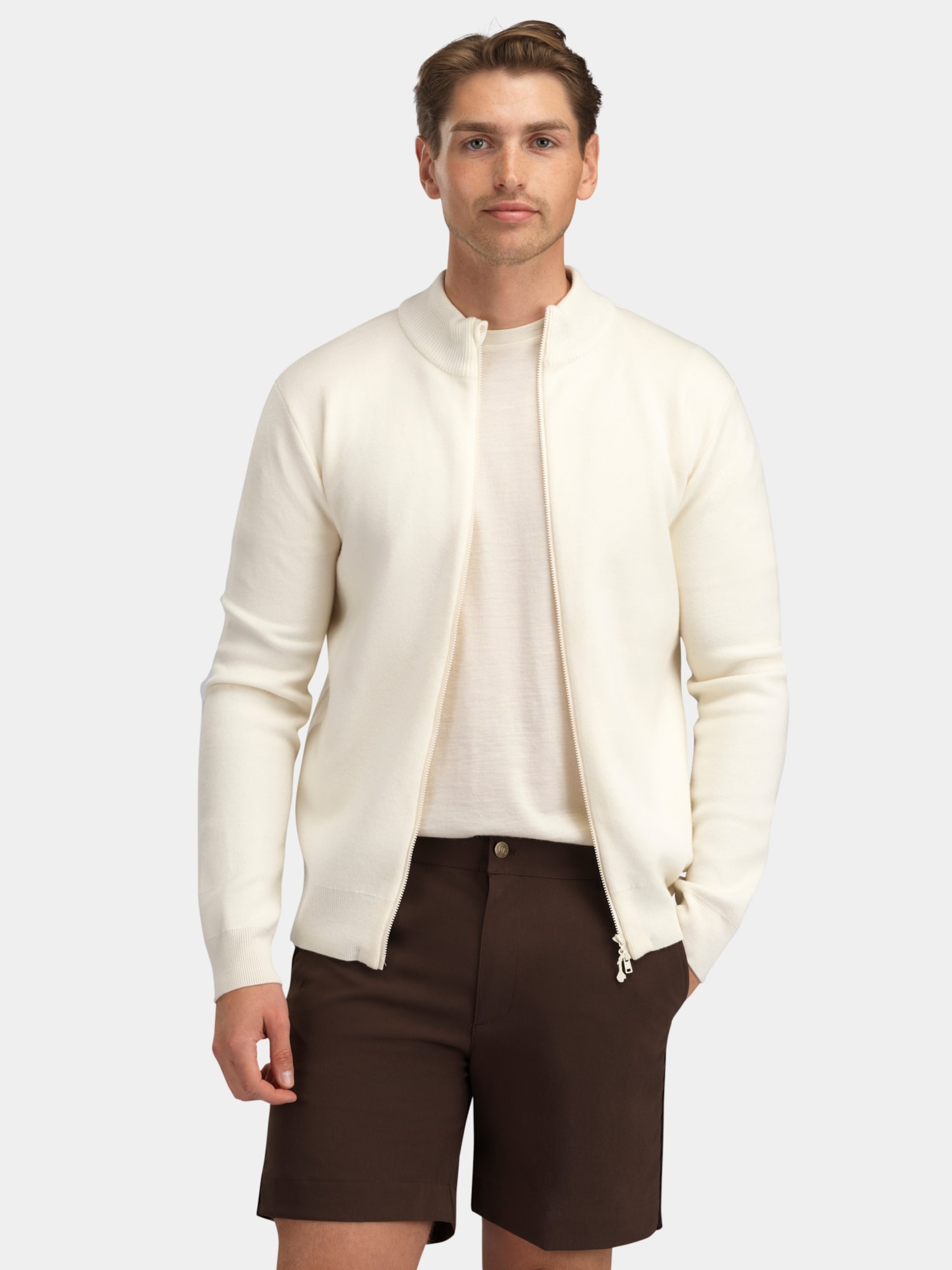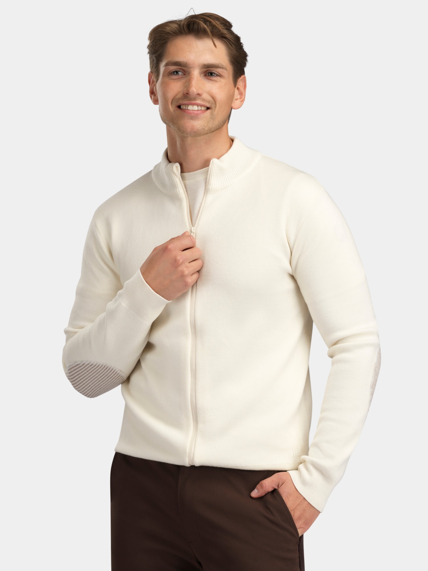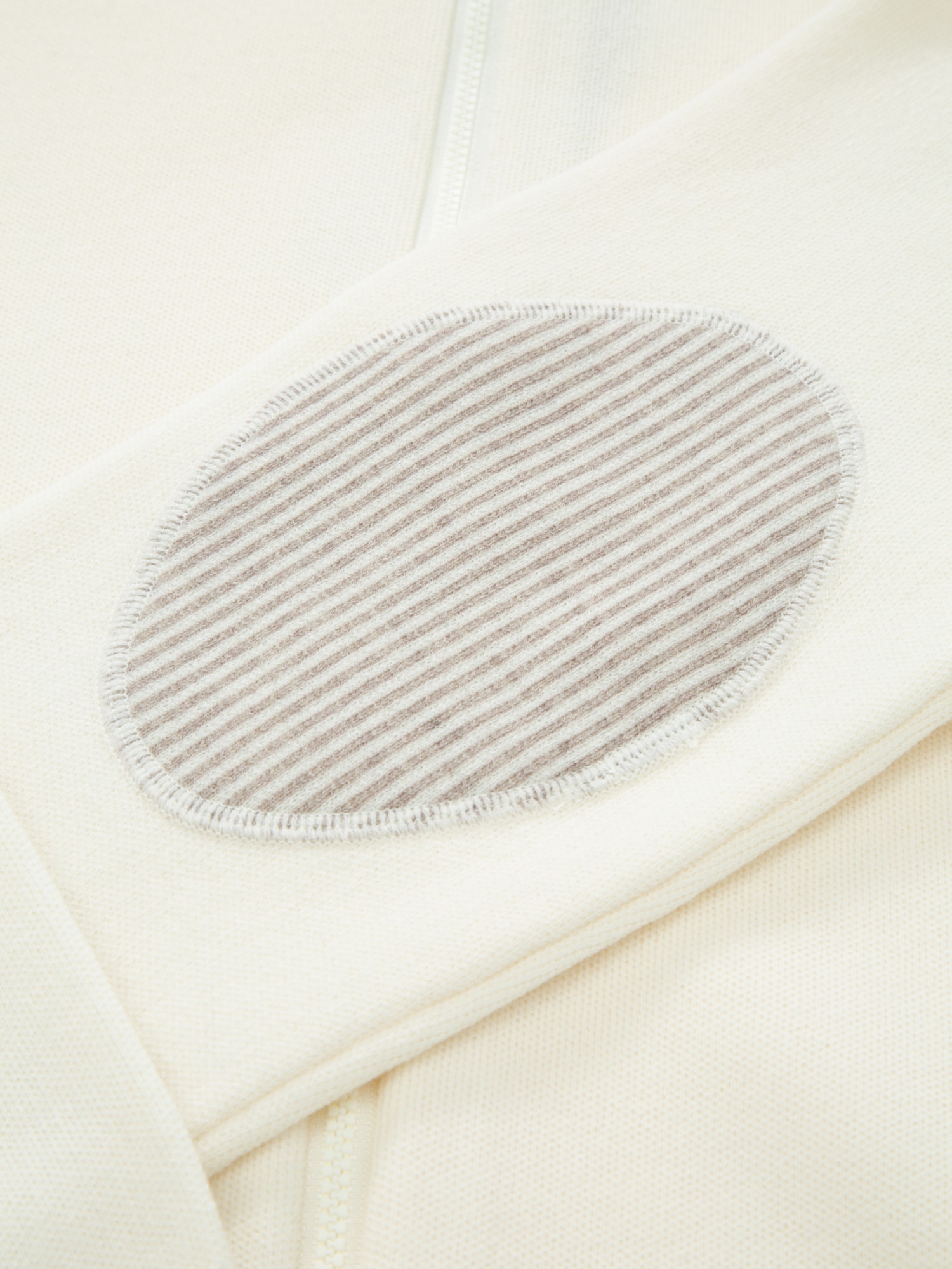 Knitted jacket with zip made in 100% wool. Ribknit across cuffs, neck and bottom. Stripes in contrasting colors over shoulders and patch on the left arm.