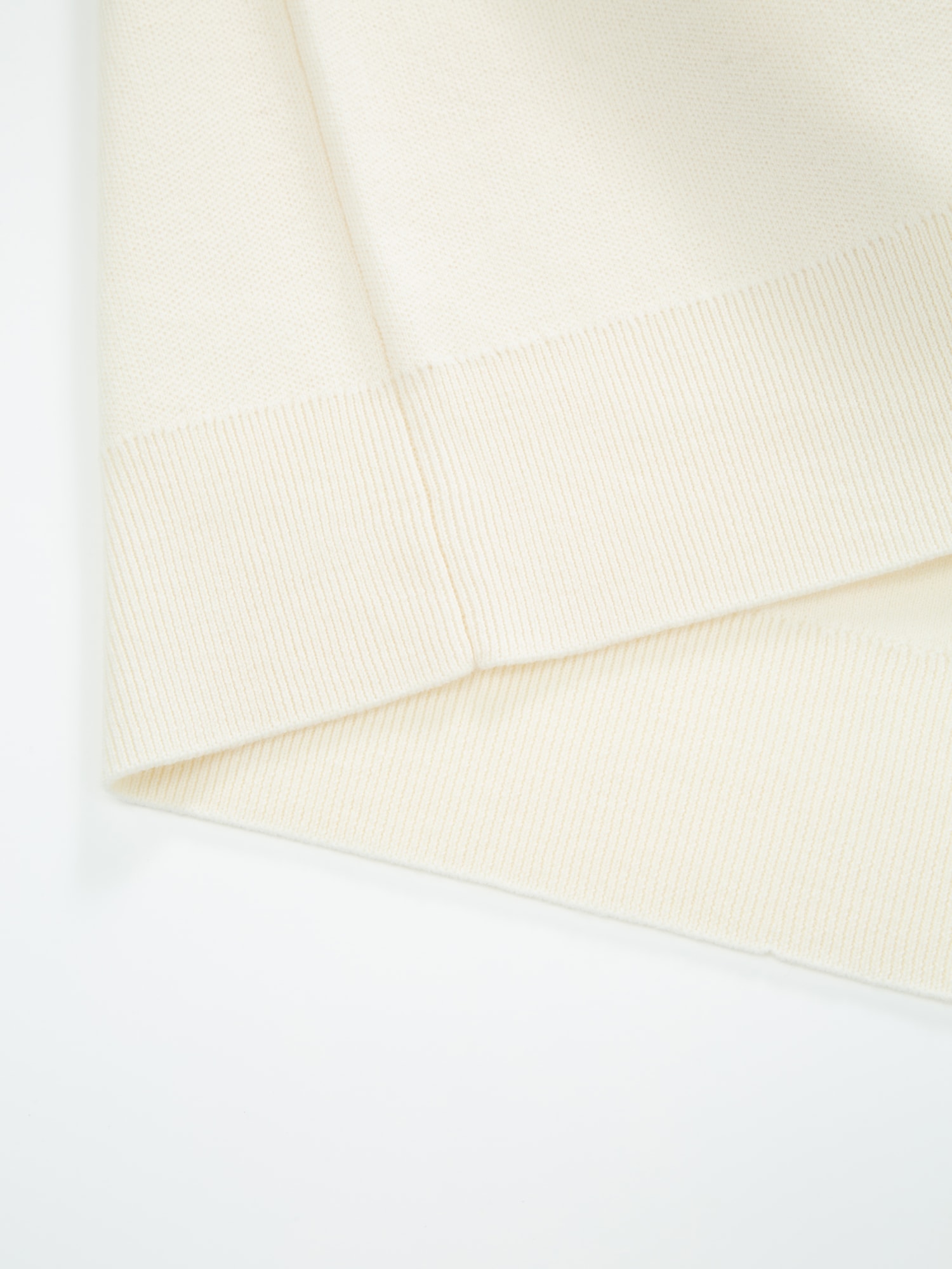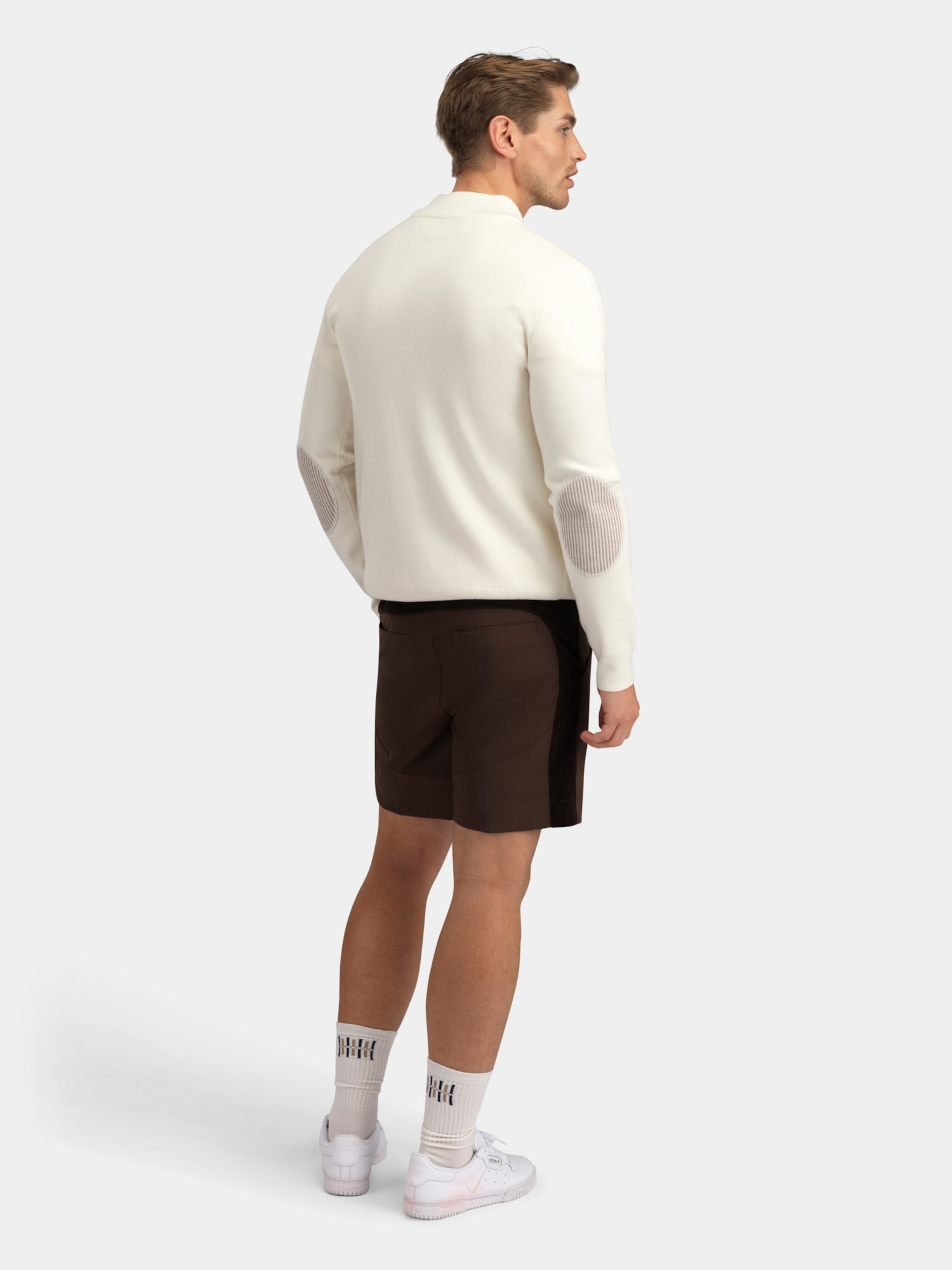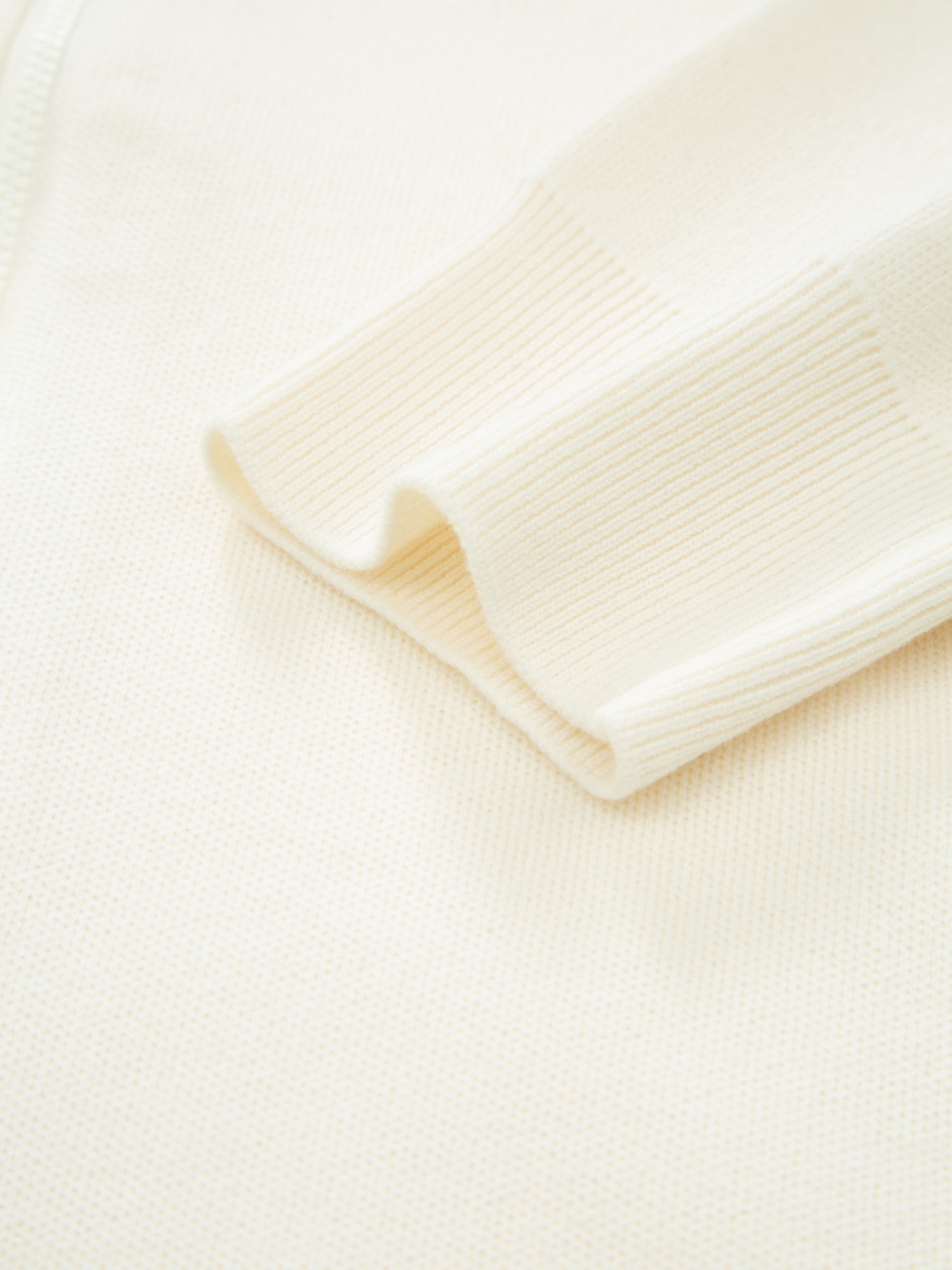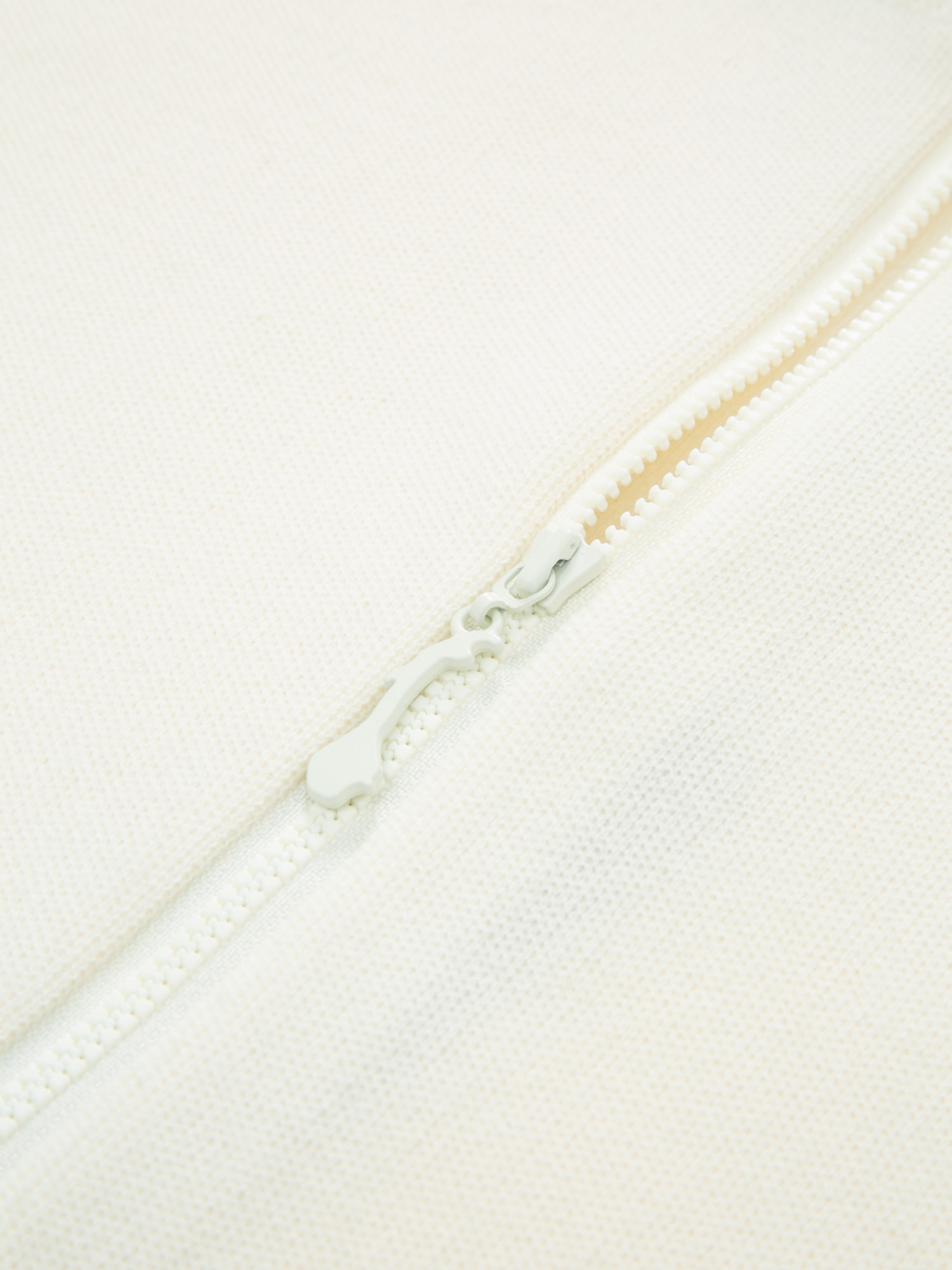 Knitted jacket with zip made in 100% wool. Ribknit across cuffs, neck and bottom. Stripes in contrasting colors over shoulders and patch on the left arm.