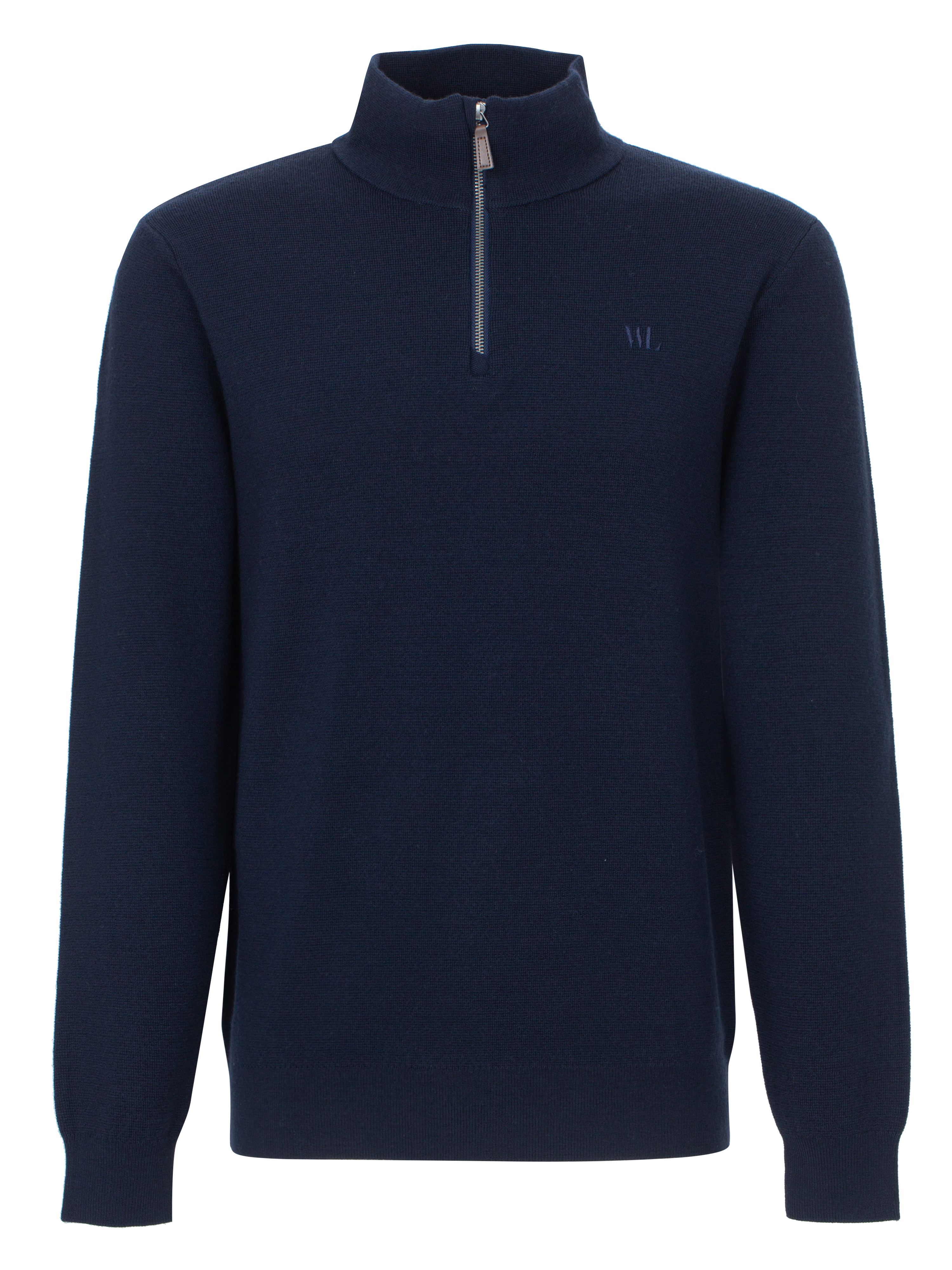 - Detaljer: Halv glidelås, høy hals, ribbestrikkede kanter