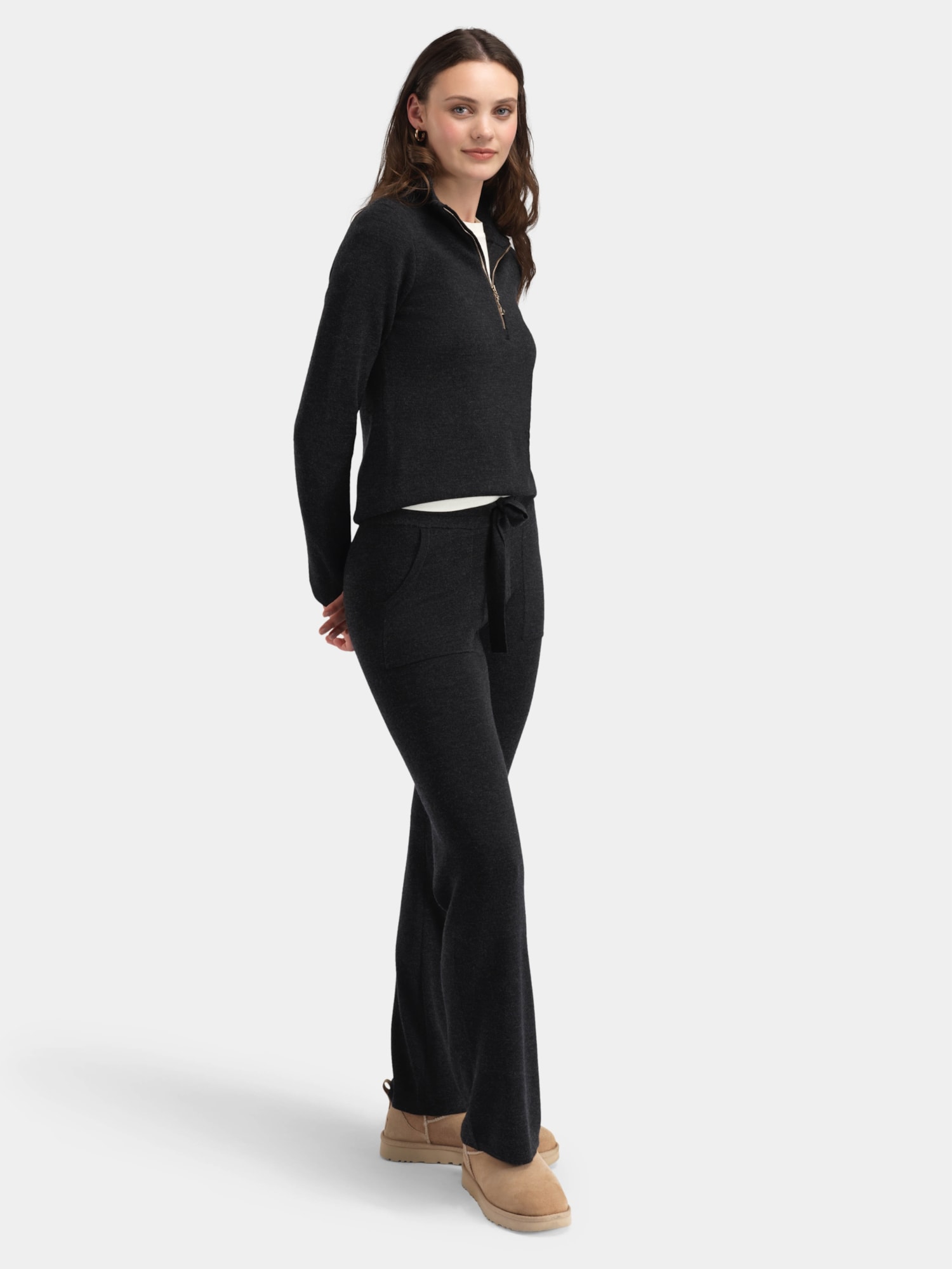 The wool trousers have a relaxed fit with a comfortable elastic waistband with lacing, and good pockets. For a complete set, use with one of our beautiful sweaters in the same color. Then you get an outfit that both looks good, is comfy and warms.