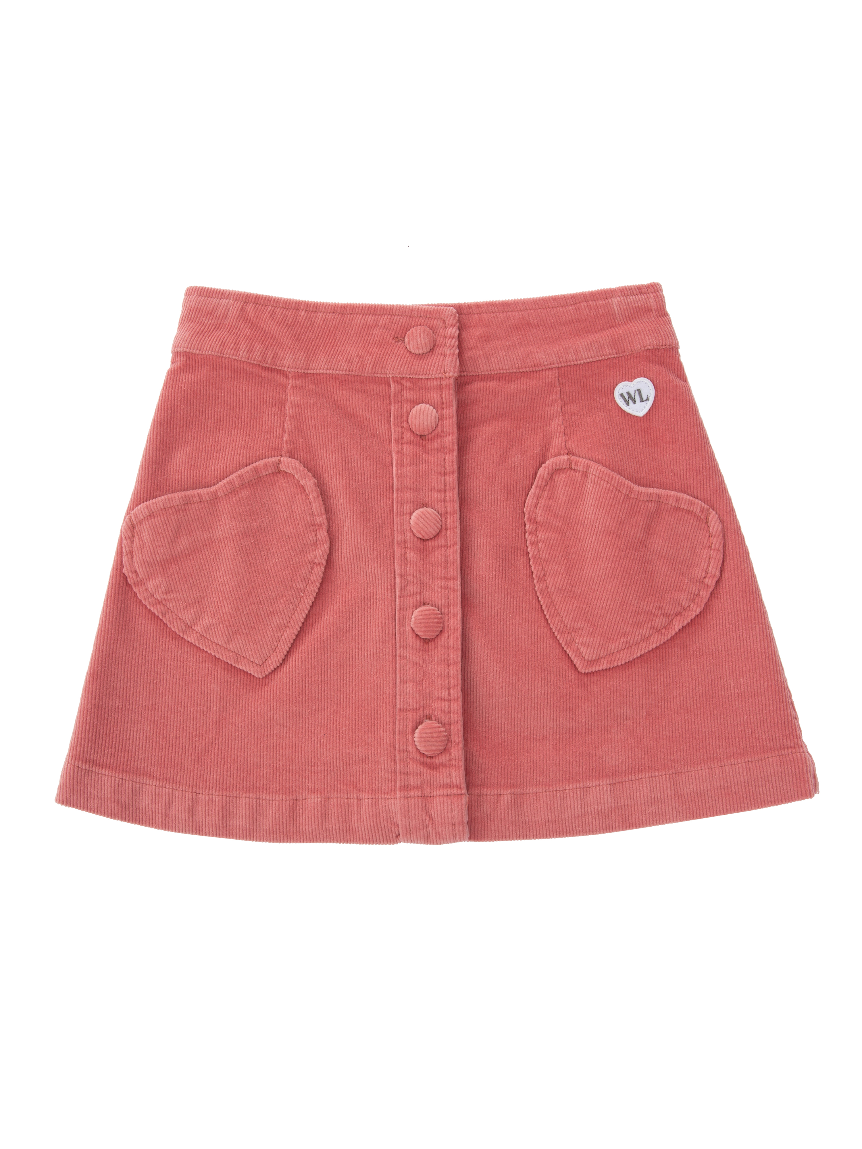 Sweet skirt for a girl in comfortable corduroy. Great fit and nice details with heart pockets, fabric-drawn buttons that match perfectly with all our merino wool tops and wool tights.