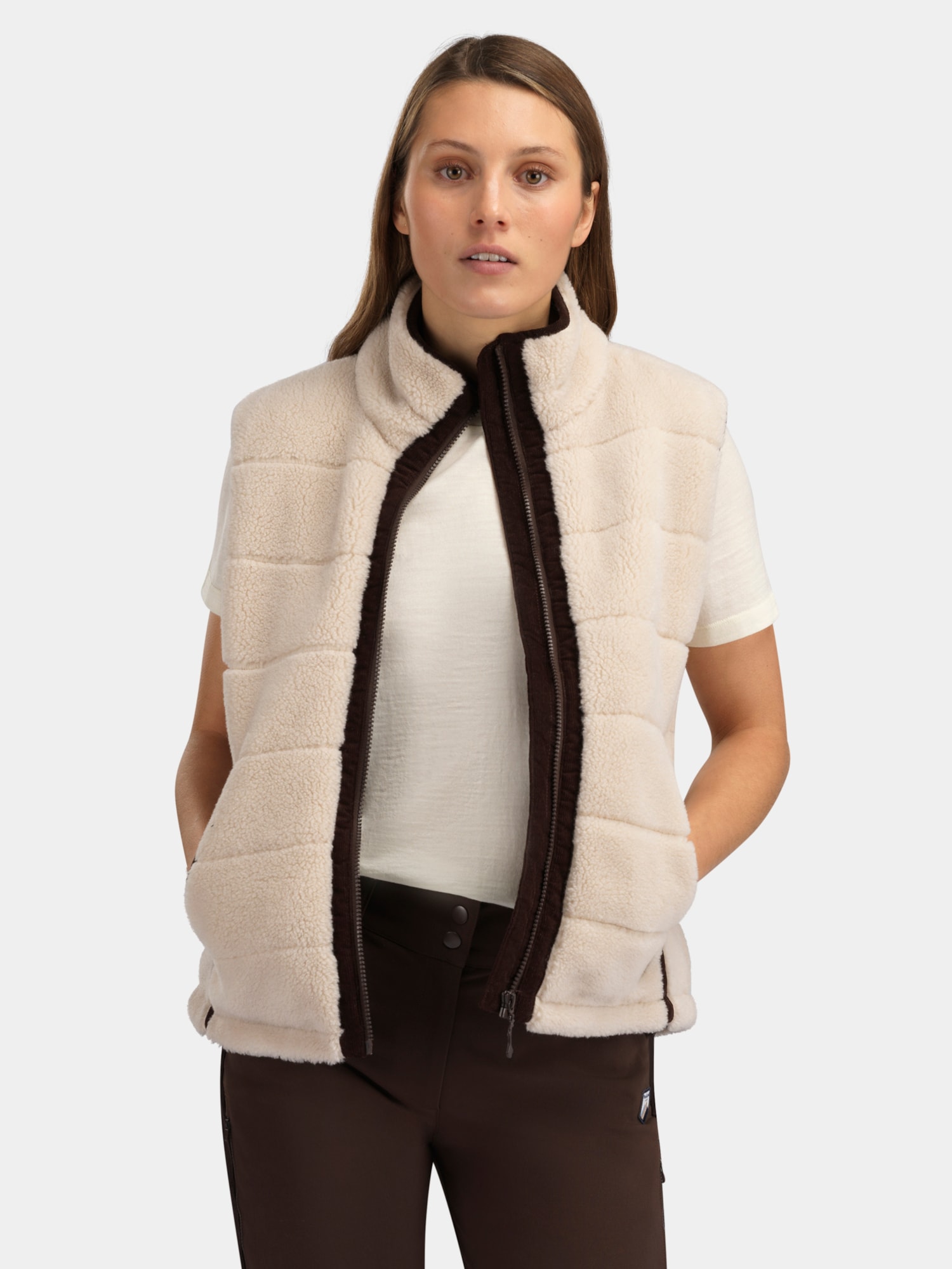 Fleece vest in a lovely teddy style. The vest features practical zippered side pockets and a stylish patch on the left chest. It works perfectly on its own when the weather allows or as a warming mid-layer under a jacket. Soft and comfortable, it is suitable for everyday wear as well as outdoor adventures.
