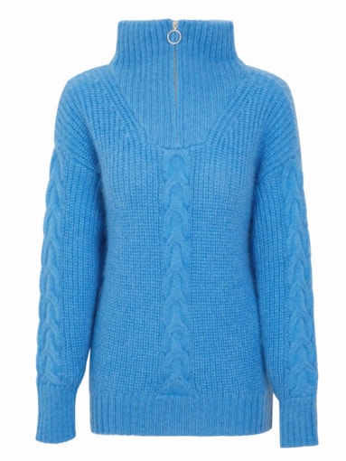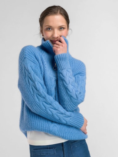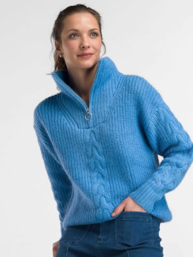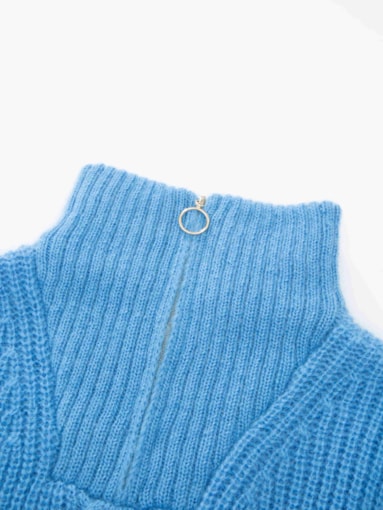 • The softest blend of kid mohair and wool to warm you. The olden sweater features a half zip and braided details on the front part and arms. This Half Zip is not as chunky as our other knitted hlavzip sweaters.