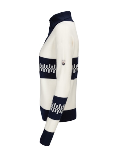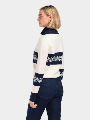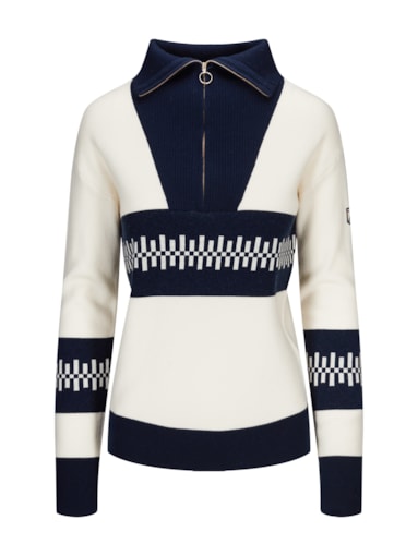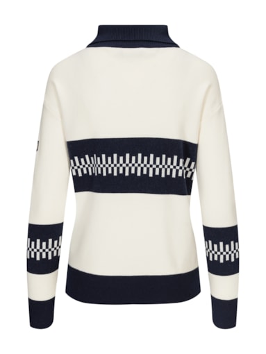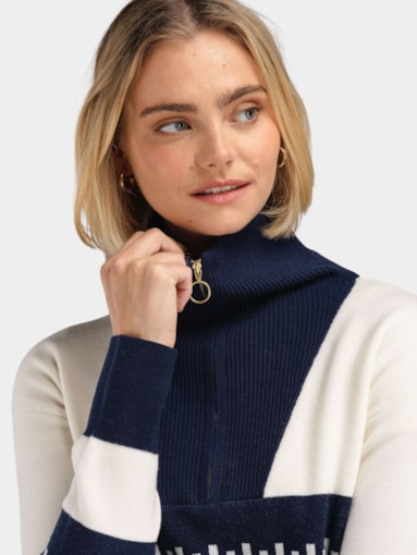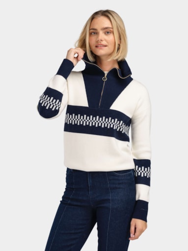 Half-zip ullgenser med unikt design i deilig og myk ull. Ribbestrikket rundt glidelås i hals. Modellen er noe kortere i fasongen.