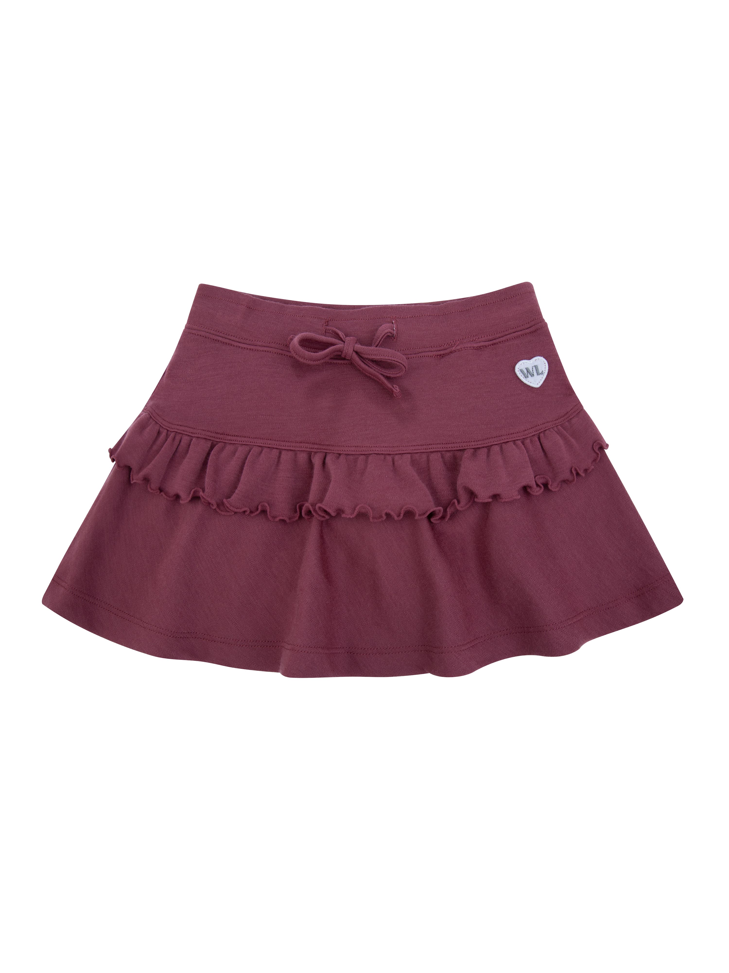 A beautiful wool skirt for girls made from 100% the softest merino wool, featuring a delicate ruffle trim. The skirt has a drawstring at the waist and extra width, giving it a lovely drape. There is also a smart wool boxer short inside the skirt to keep girls warm while looking stylish.