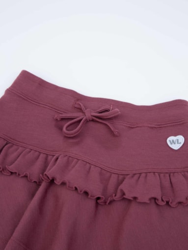 A beautiful wool skirt for girls made from 100% the softest merino wool, featuring a delicate ruffle trim. The skirt has a drawstring at the waist and extra width, giving it a lovely drape. There is also a smart wool boxer short inside the skirt to keep girls warm while looking stylish.