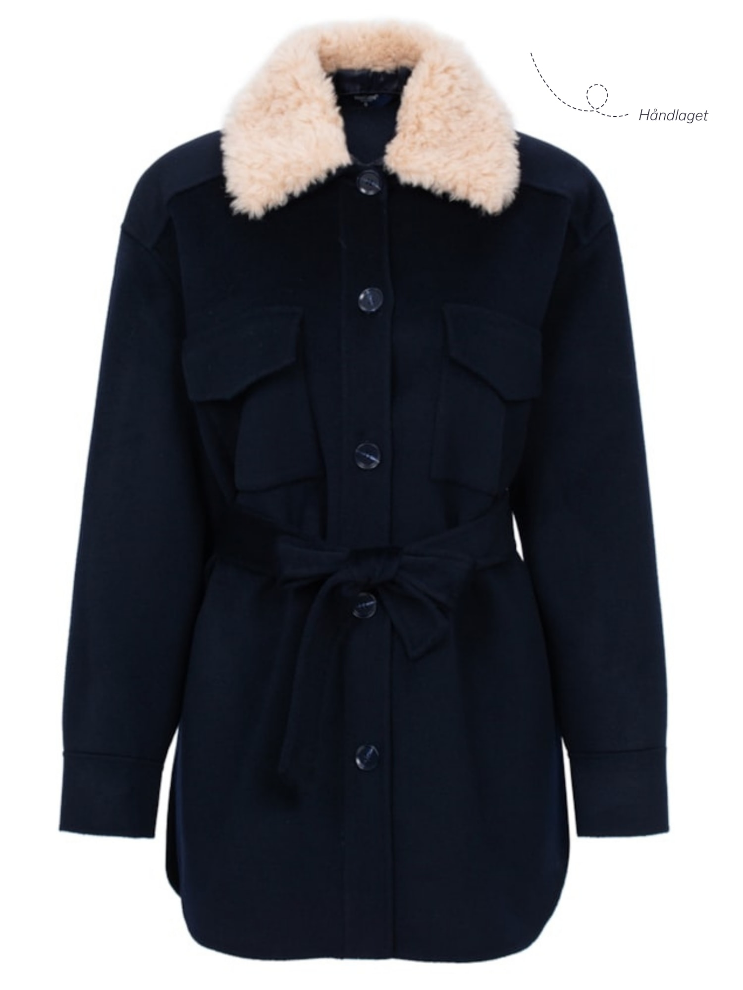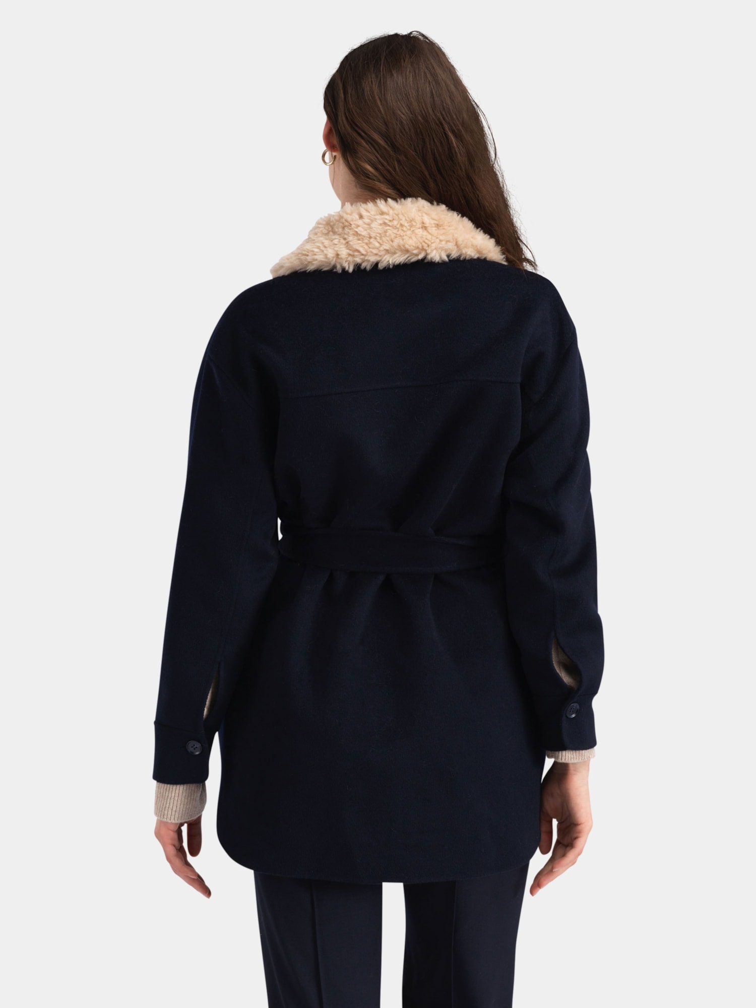 • Skålatårnet Jacket is an elegant outerwear piece for women, designed with the silhouette of a shirt. It is crafted from a luxurious blend of 90% merino wool and 10% cashmere for optimal warmth and comfort. The jacket features a waist belt and both chest and side pockets, combining functionality with a refined look. It also comes with a detachable shearling collar made from 100% lambswool, offering extra warmth and a stylish finish.