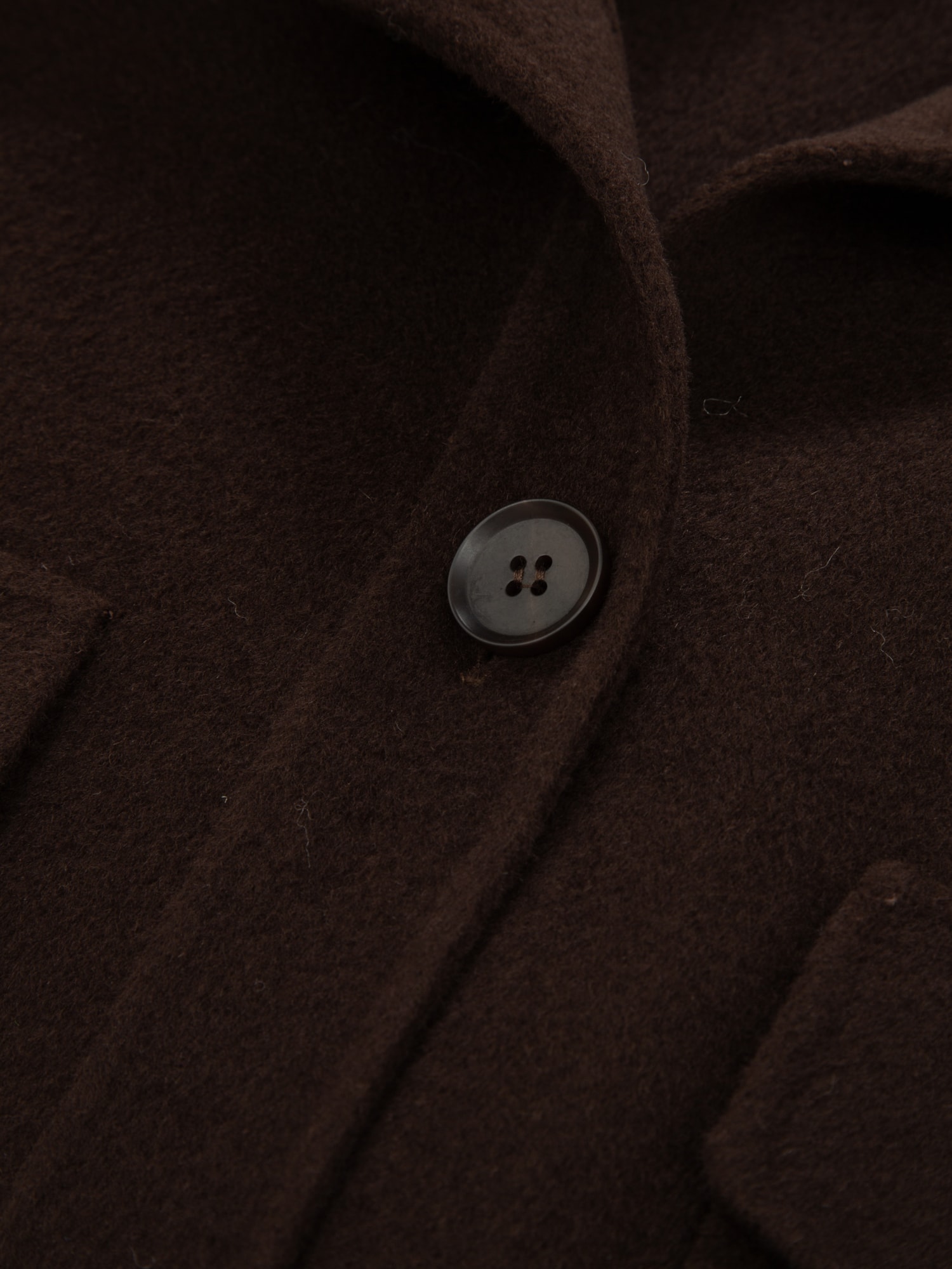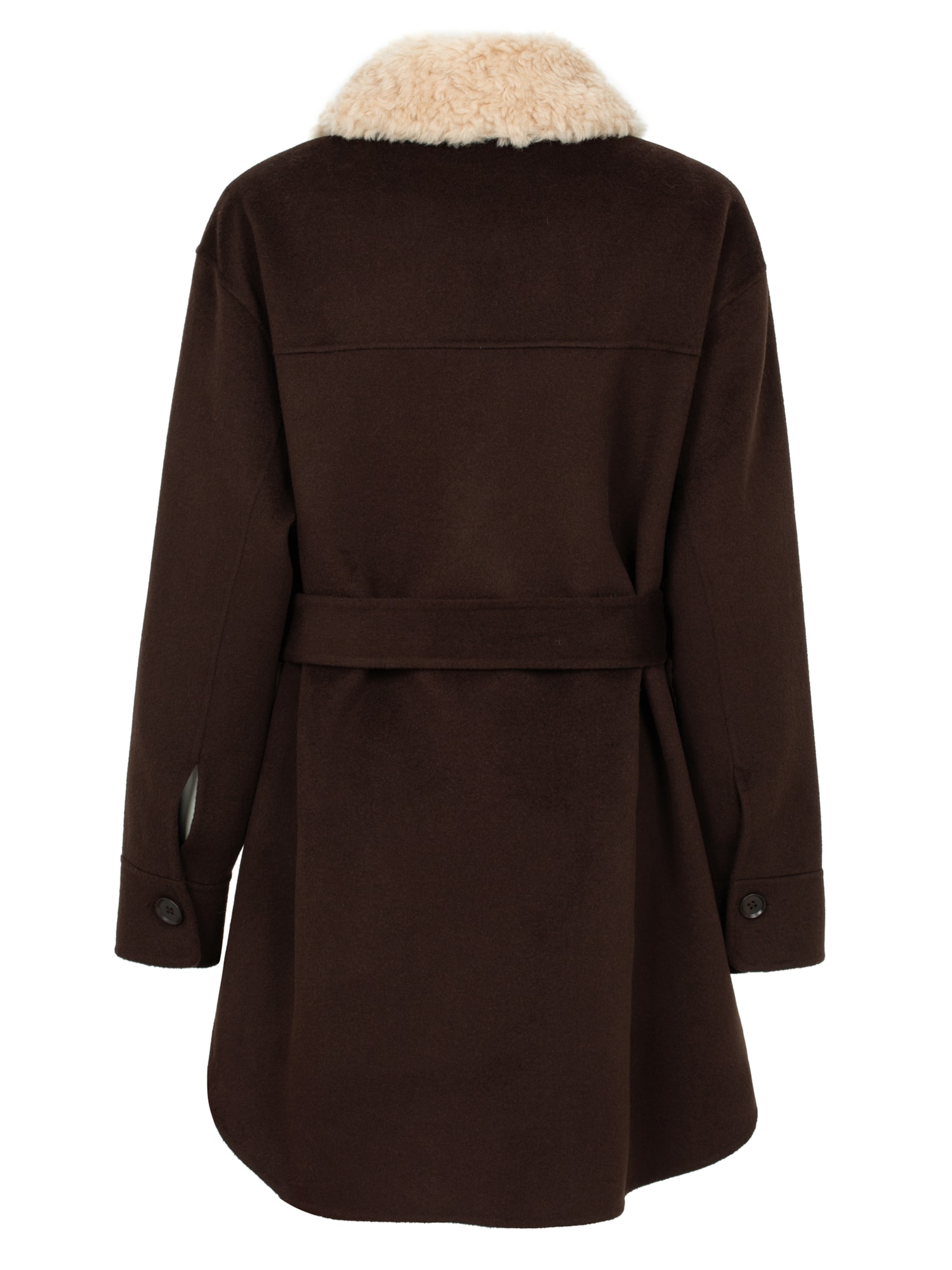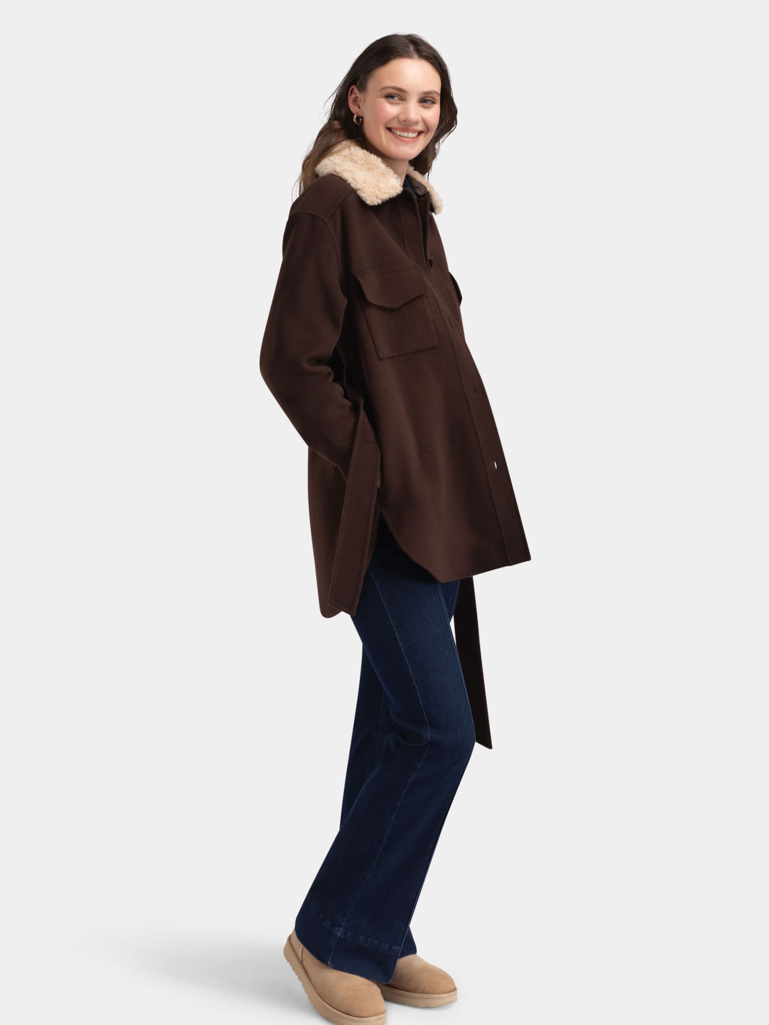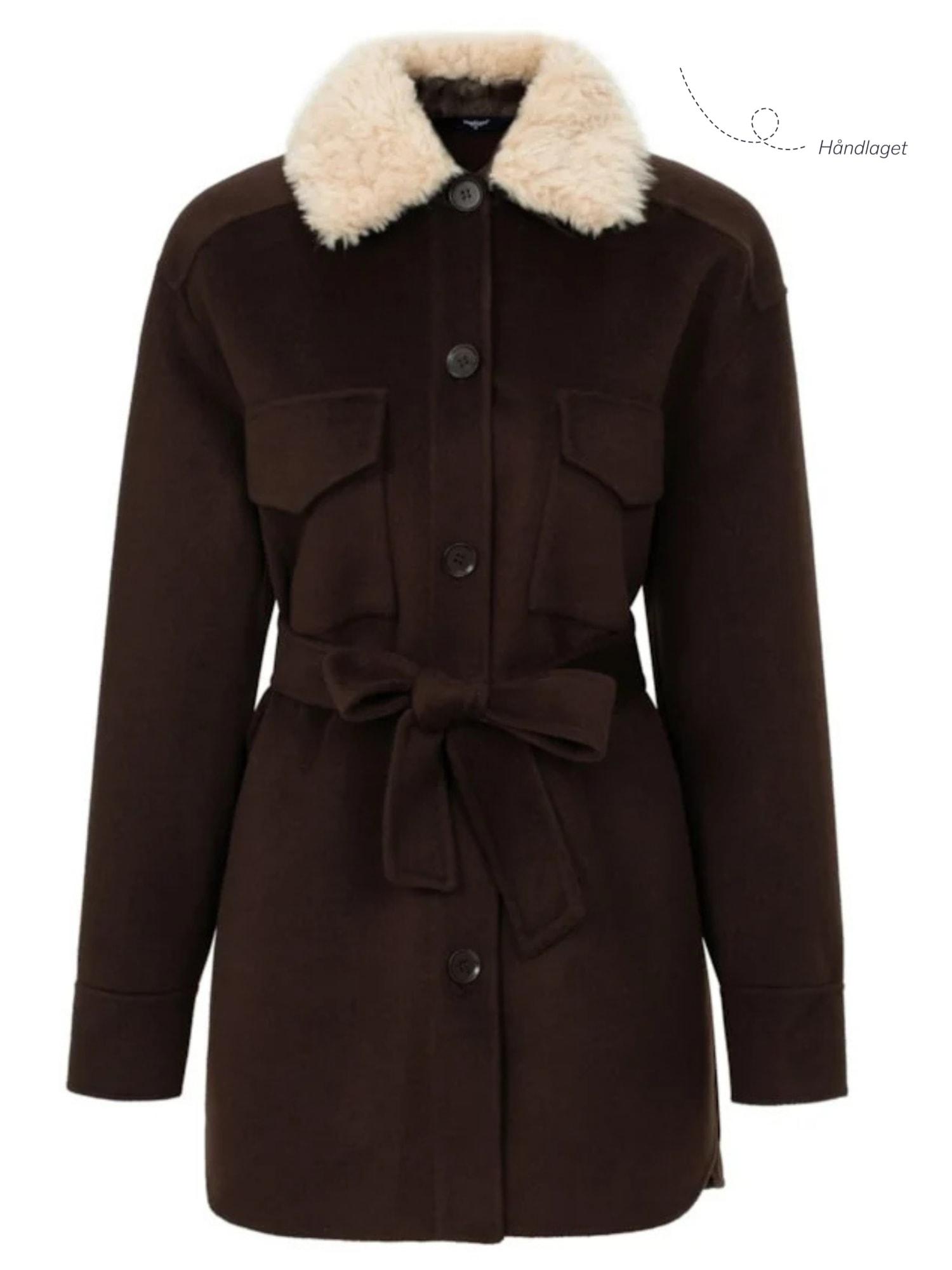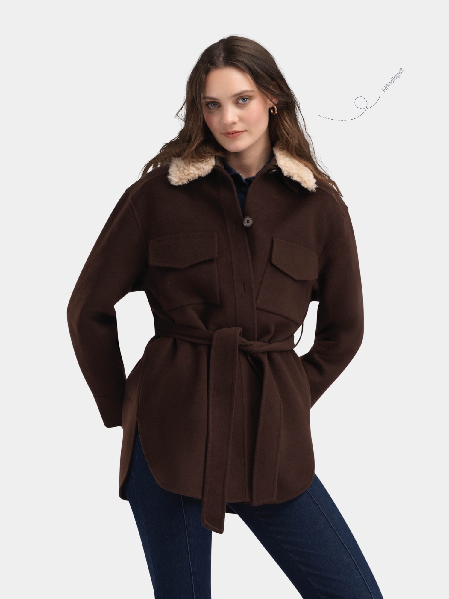 Skålatårnet Jacket is an elegant outerwear piece for women, designed with the silhouette of a shirt. It is crafted from a luxurious blend of 90% merino wool and 10% cashmere for optimal warmth and comfort. The jacket features a waist belt and both chest and side pockets, combining functionality with a refined look. It also comes with a detachable shearling collar made from 100% lambswool, offering extra warmth and a stylish finish.