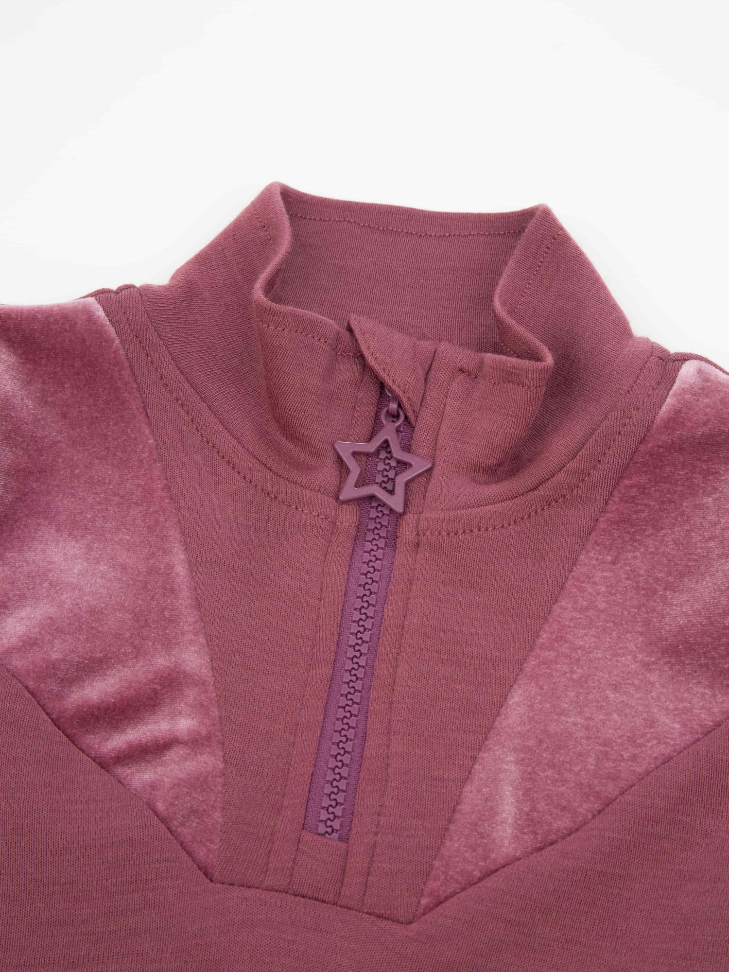 Undredal Half-Zip Ullgenser er en myk og feminin ullgenser laget i 100 % merinoull. Genseren har et unikt design med markert V-formet frontpanel med kontrastpaneler i velour, dekorativ stjerneglidelås , kombinert med delikate pufferm som gir et moderne og elegant uttrykk. Med sin myke kvalitet og normale passform er den perfekt til både skole, hverdagsbruk og finere anledninger.